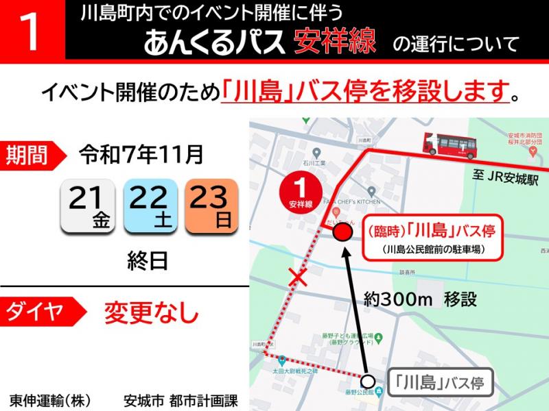川島町内での「第19回藤野町民ふれあいまつり」開催に伴い、令和7年11月21日(金曜日)から11月23日(日曜日)まで、あんくるバス1番安祥線の「川島」バス停を川島公民館前の駐車場へ移設します。
