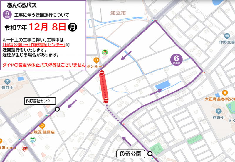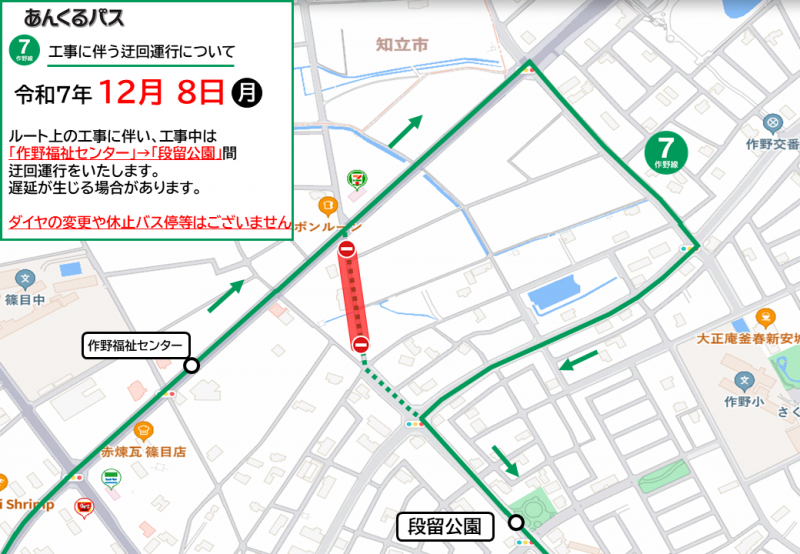 篠目町内でのあんくるバスルート上の工事に伴い、令和7年12月8日(月曜日)の工事規制中、あんくるバス6番西部線および7番作野線は一部迂回運行をいたします。遅延等が生じる場合がありますので、ご承知おきください。