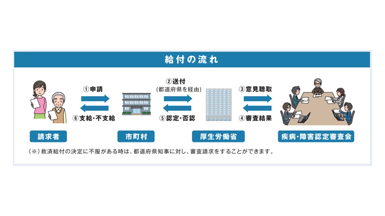 なお、申請から給付が決定するまでは、数か月から2年程度の時間を要する場合もあります。また、不認定となり給付対象外となる場合もあります。厚生労働省の審査会の状況は、下記よりご確認ください。