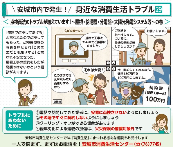 最新回「点検商法のトラブルが増えています!~屋根・給湯器・分電盤・太陽光発電システム等~の巻」(広報あんじょう令和8年2月号)(JPG:148KB)