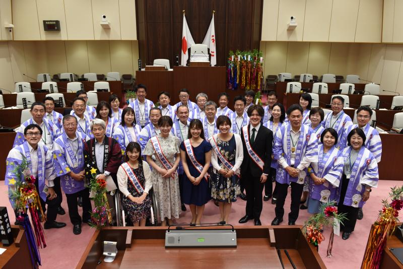 大使たちは、生まれ変わった安城七夕音頭をBGMに入場し、それぞれに安城七夕まつりへの意気込みを語り、議長からは激励の言葉をかけられました。