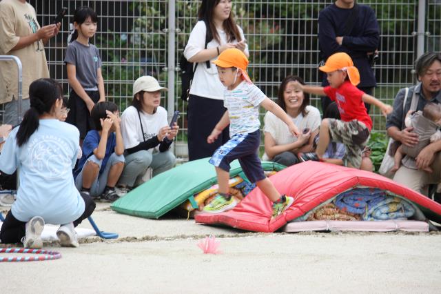 年少児は初めての運動会。踊ったり、走ったりして“体を動かすのが楽しい!”という笑顔で溢れていました。『おやこでビューン』という親子遊びでは乗り物になりきって、おうちの人に抱っこや“たかいたかい”をしてもらい、親子の触れ合いを楽しみました。