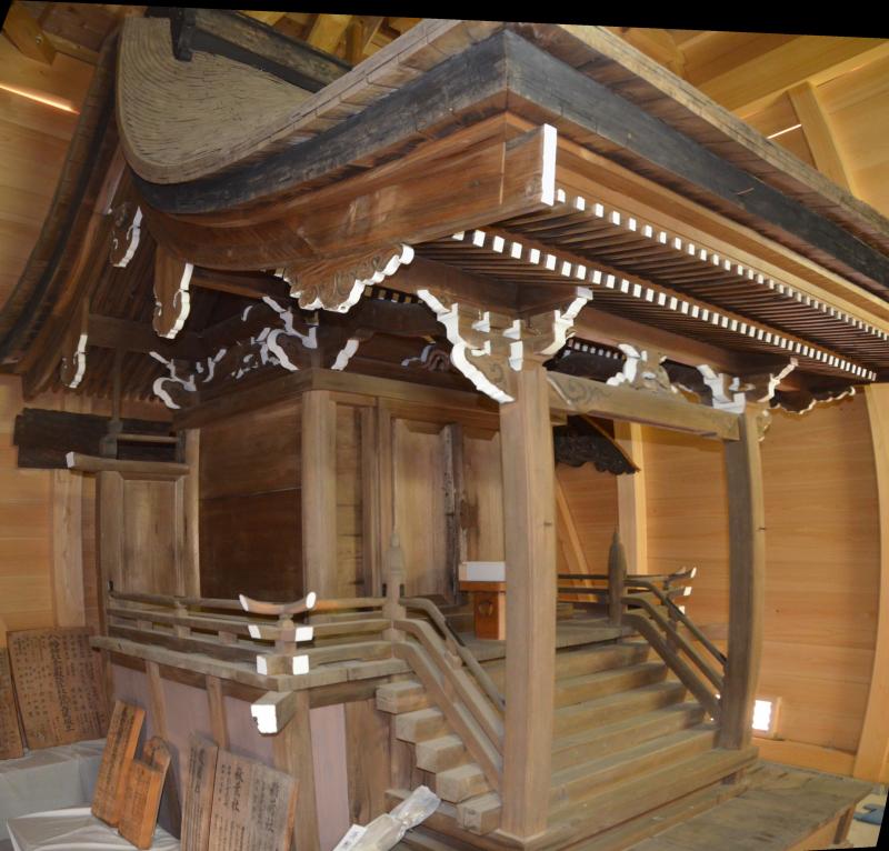 これら本殿および覆殿については、平成 24 年12 月から同 26 年4月に修理工事を実施しました。この工事は、当初形式・技法部材等を可能な限り損なわないよう、文化財同等の手法にる修理を実施して いますので、その価値は十分に保たれています 。