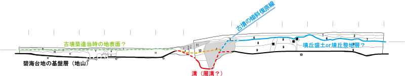 上写真の点線より左側に貝層が堆積していました。 点線より右側は、後世の掘削でなくなってしまったようです。 |