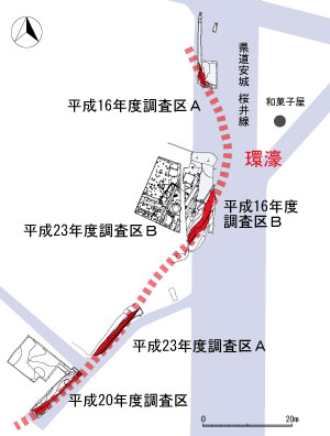 概要 古井町に所在し、碧海台地の東縁を掘りこんで流れる堀内川に向かって、北から舌状に突出した台地上の先端に立地しています。現況で台地の標高は約13m、東方の水田面との高低差は、約4mです。東側の開析谷内には同時期の釈迦山遺跡が立地しています。1964 (昭和39)年に畑の土取り工事中に完形の土器が多量に出土したため、緊急調査が実施されました。調査の結果、幅3.0m、深さ2.5mと推定される溝状遺構が発見されました。調査区内で73.5mにわたって発掘され、工事区域の外側でも一部確認できたので、全長は少なくとも120m以上あったと推測されます。溝は断面がV字形になるよう深く掘り込まれています。 環濠復元図