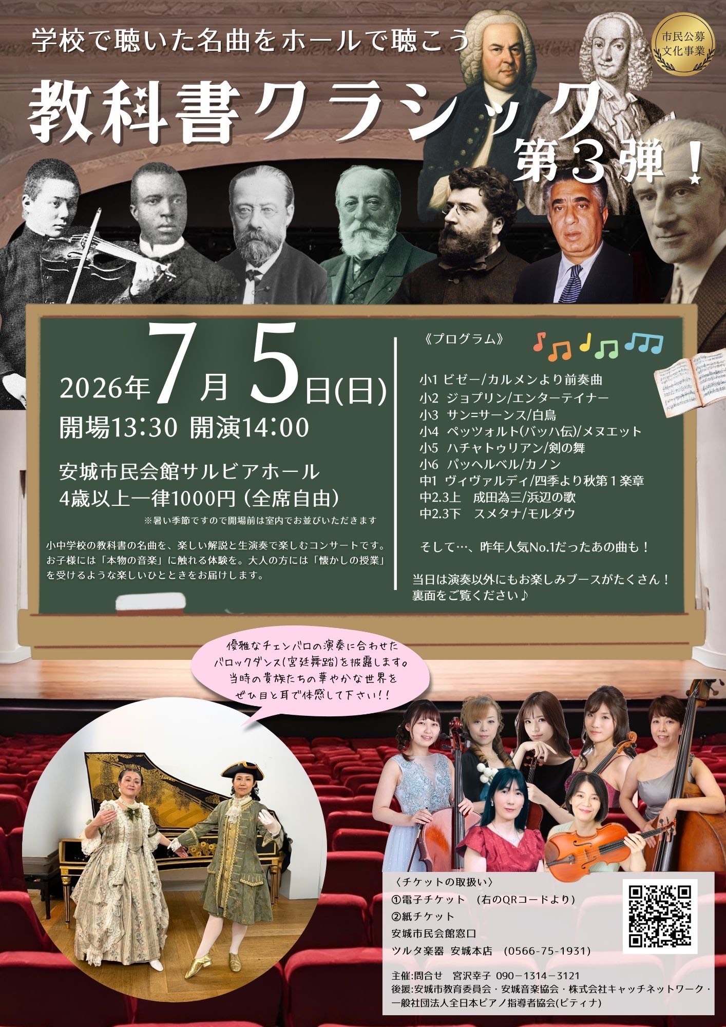 小中学校の教科書の名曲を、楽しい解説と生演奏で楽しむコンサート。お子様には「本物の音楽」に触れる体験を、大人の方には「懐かしの授業」を受けるような楽しいひとときをお届けします。