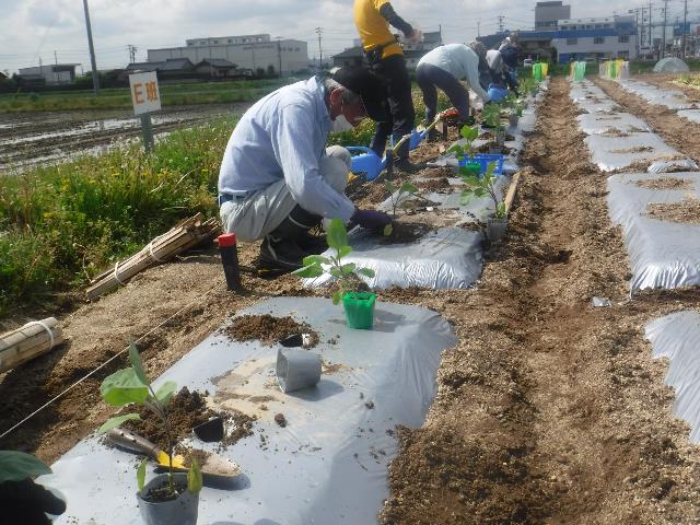 19日(火)は、ナス・ピーマン・トマトを植付けましました。続いてアンドンを設置しました。さらにメロンを植付け、トンネルを被せました。