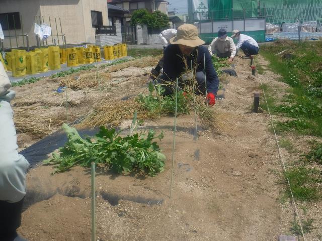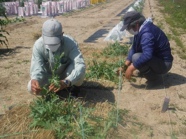 スイカのワラの増設に続き、誘引と整枝を演示した後一斉に誘引と脇芽欠きを行いました。
