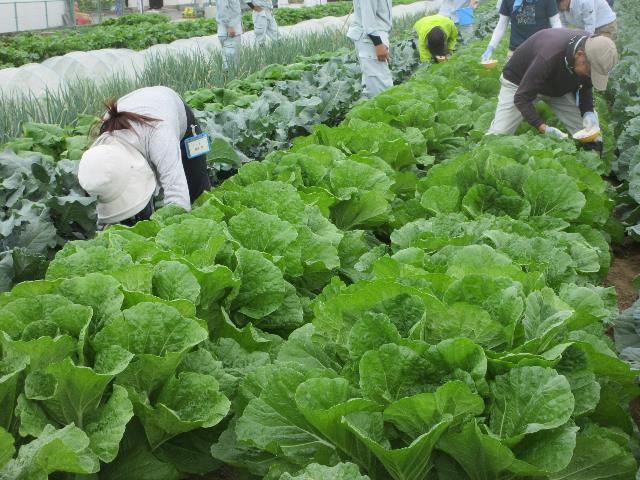 1日(火)は、キャベツ・ハクサイ・ブロッコリーに鶏糞を施した後ネギ及びダイコンに追肥を施しました。
