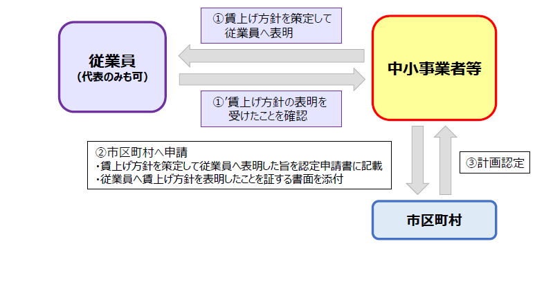 ※(記載例)従業員への賃上げ方針の表明を証する書面(PDF:92KB)賃上げ方針を計画内に位置付けることができるのは新規申請時のみです。変更申請時に賃上げ方針を計画内に追加することはできません。